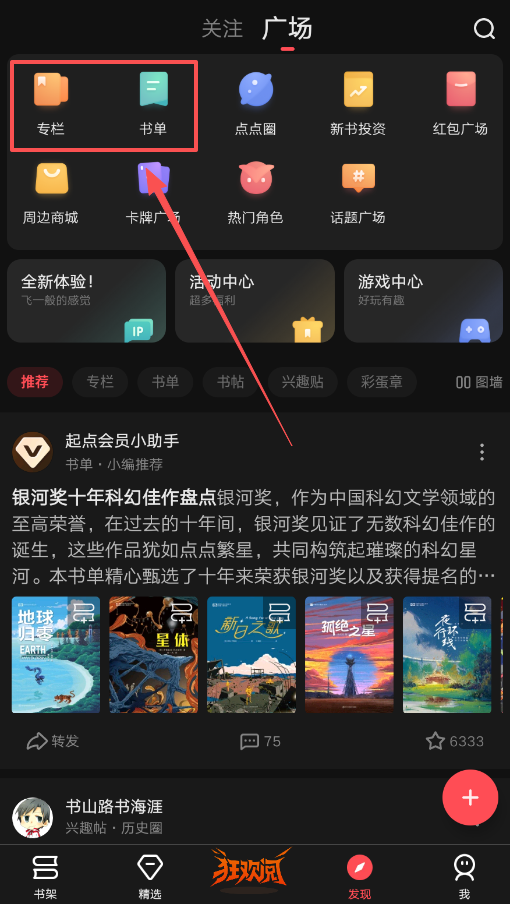 2、发现页有更多互动功能,像是书单、专栏和话题广场,可以找到同好或参与讨论,这里也有卡牌、游戏等趣味活动。