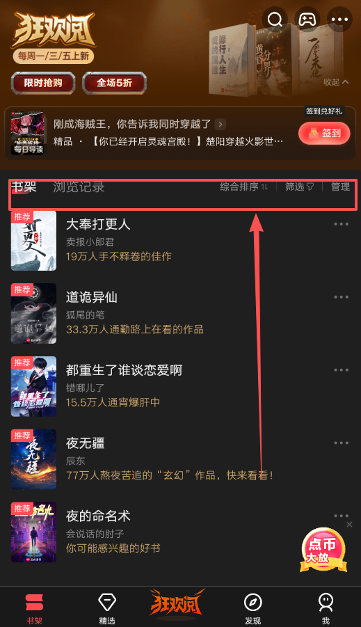 4、管理书架很方便,浏览记录里会保存你的阅读进度,书架支持综合排序、筛选和管理,长按书籍可以进行移除或分类。