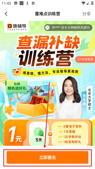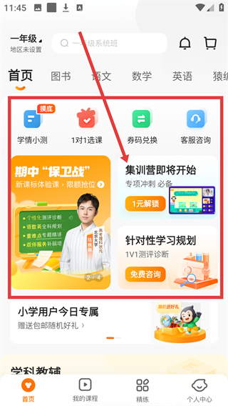1、在首页找到【集训营即将开始】入口,点击可进入重难点训练营的报名页面哦。