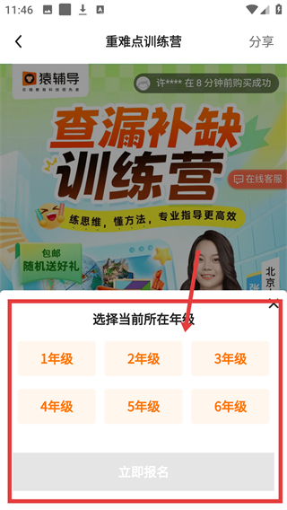3、报名时选择对应的年级,比如当前所在的【1年级】,选好后就能继续啦。