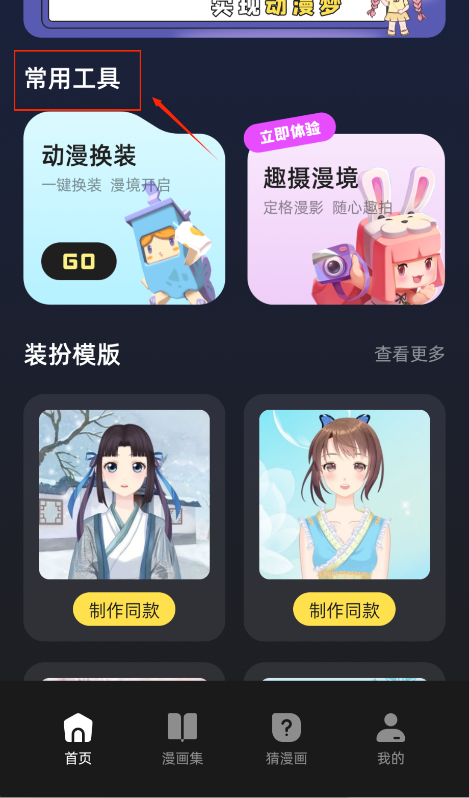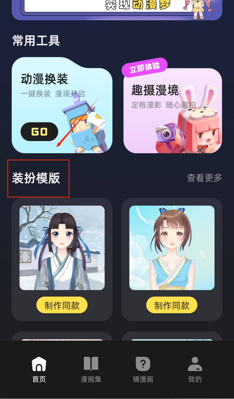 1、常用工具里的动漫换装超有意思,点击GO按钮就能给角色一键换装,各种古风现代造型随心搭配,满足你的造型创作欲。
