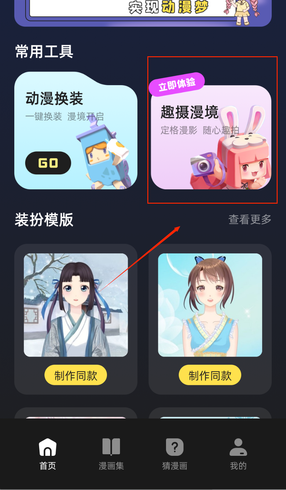 2、趣摄漫境可以拍摄动漫风格照片,点击立即体验就能使用,选择喜欢的滤镜和贴纸,制作专属漫感大片分享给朋友。