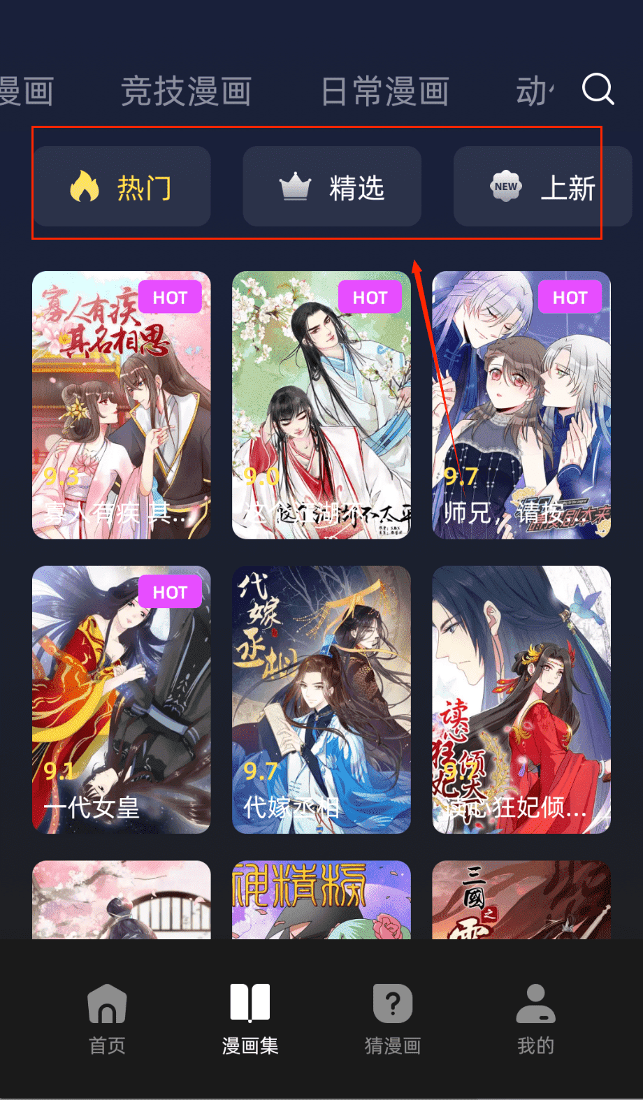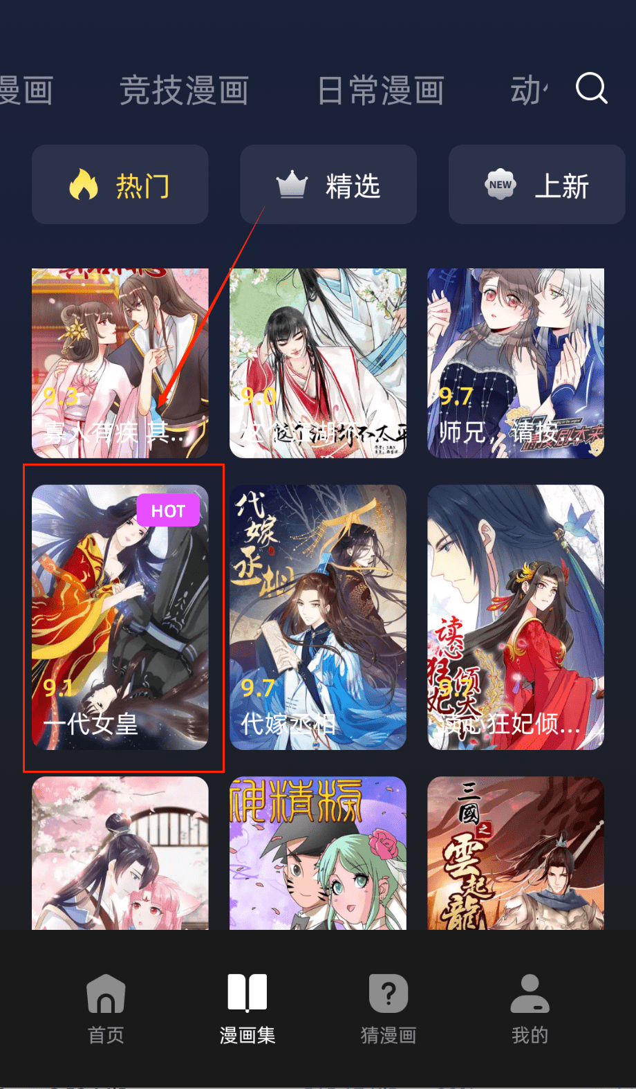 1、首页的历史漫画标签汇集了大量高分作品,比如评分9.7的《代嫁丞相》和9.1的《一代女皇》,通过评分可以快速判断作品质量。