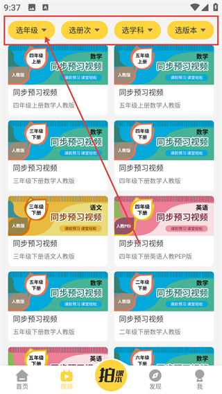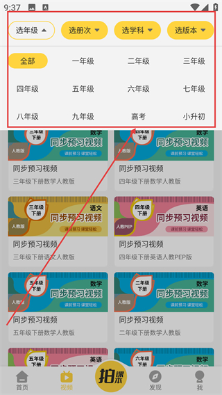 2、进入视频页面后,可通过【选年级】【选册次】等按钮筛选视频,找到对应学段的同步预习内容哦。