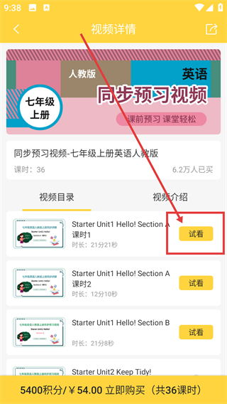 4、进入视频详情页后,点击课时旁的【试看】按钮,就能预览该同步预习视频的内容啦。
