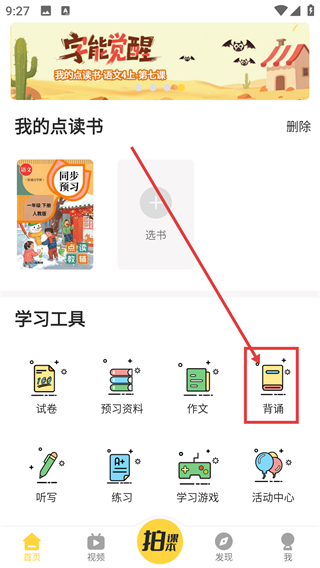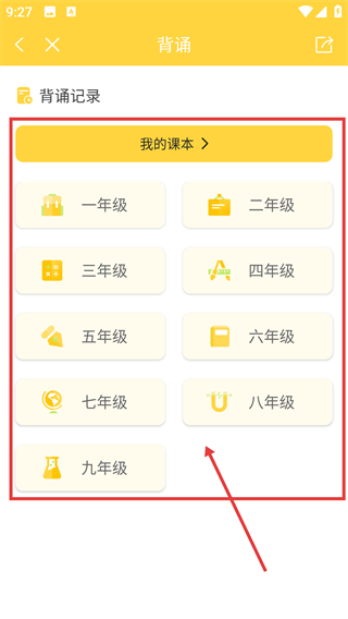 1、在首页学习工具区域点击【背诵】选项,就能进入背诵功能的年级选择界面,开启背诵任务啦。