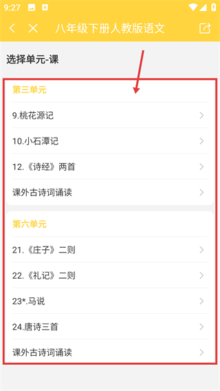 4、进入单元-课页面后,选择具体的课文(比如桃花源记),就能开始该内容的背诵练习任务啦。