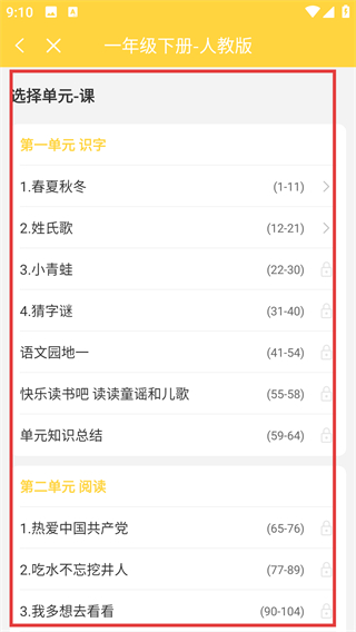 4、进入教材单元页后,能看到各单元的课程列表,选对应的课比如【1.春夏秋冬】,就能开始学习对应内容啦。