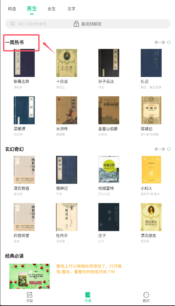 1、打开软件后,首先会看到底部有书架、书城和我的三个导航按钮。点击书城进入主界面,上方有精选、男生、女生、文学等分类标签。
