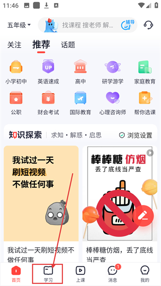 1、进入主界面后,点击底部的【学习】按钮,就能切换到学习板块,开启内容学习啦。