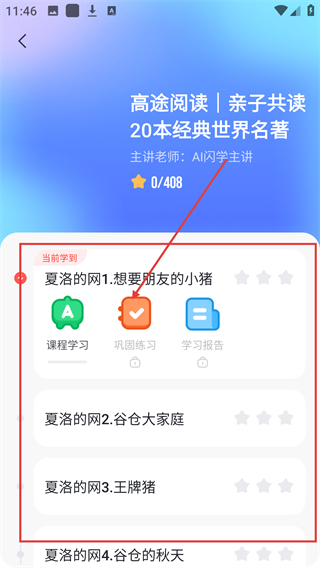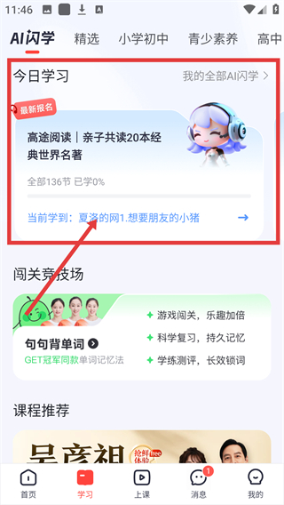 2、在学习页找到【今日学习】区域,点击【当前学到:夏洛的网1.想要朋友的小猪】,就能进入对应课程哦。