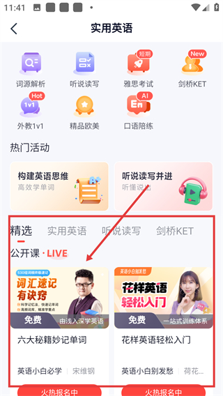 2、进入实用英语页后,找到公开课板块的课程卡片,选择目标课程(如词汇速记类),点击进入课程详情页哦。