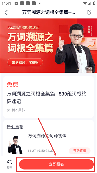3、在课程详情页,点击底部的【立即报名】按钮,完成课程的报名操作,即可解锁课程学习权限呀。