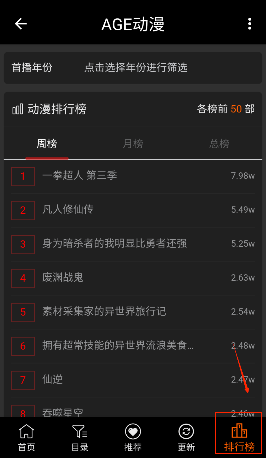 3、排行榜的不同榜单各有侧重,周榜适合追新番,总榜适合补经典,可根据需求选择查看。