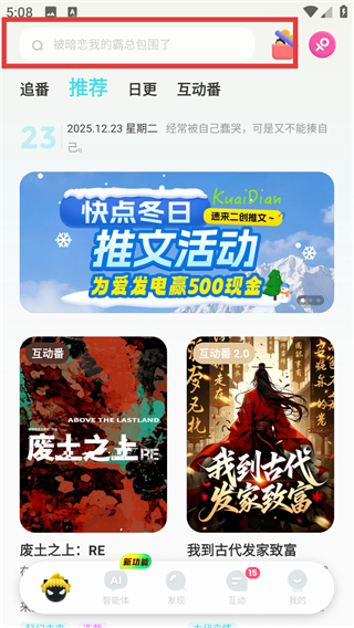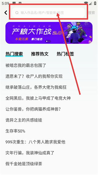 1、在主界面点顶部的搜索框,输入想找的内容关键词,就能快速定位到对应的作品啦。