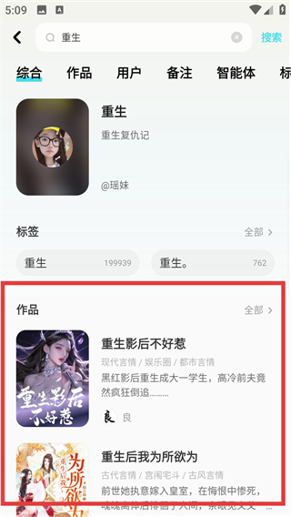 3、搜索结果里找到【作品】板块,选感兴趣的内容,像【重生影后不好惹】这类作品超吸引人呀。