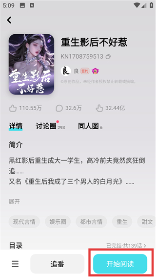 4、进入作品详情页后,点【开始阅读】按钮,就能沉浸到这个重生题材的故事内容里啦。