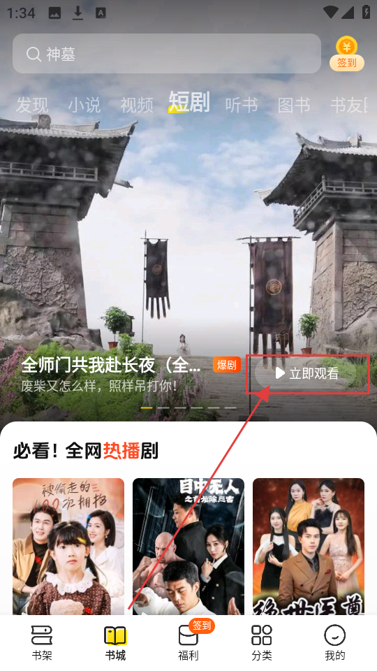 2、在短剧页面,找到感兴趣的短剧,比如看到的推荐短剧,点击【立即观看】,开始播放短剧哦。