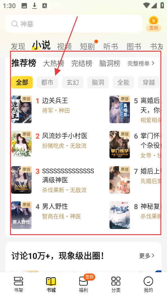 1、在书城的小说推荐榜里,挑选感兴趣的小说类型,找到想读的小说,点击进入详情页。