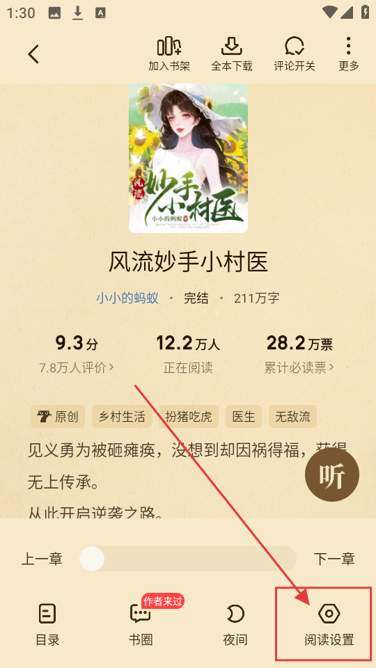 2、进入小说详情页后,点击【阅读设置】按钮,可对阅读相关参数进行调整。