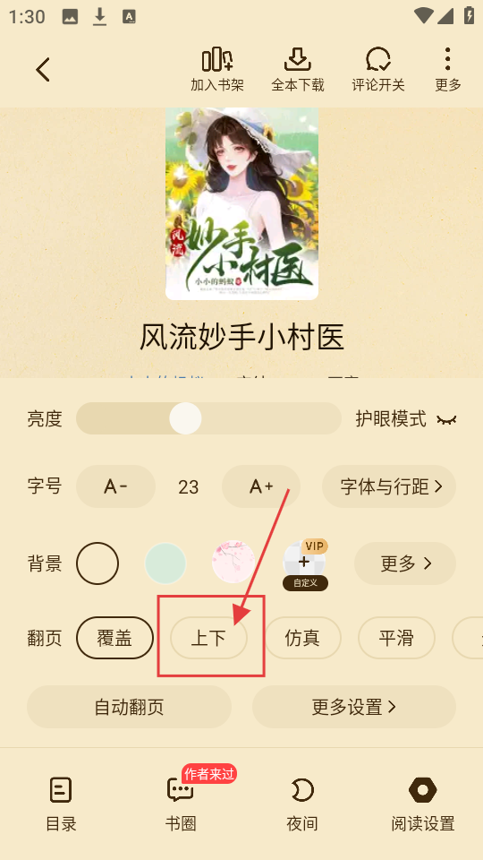 3、在阅读设置里,找到翻页设置,选择【上下】翻页模式,设置好后返回阅读页面。