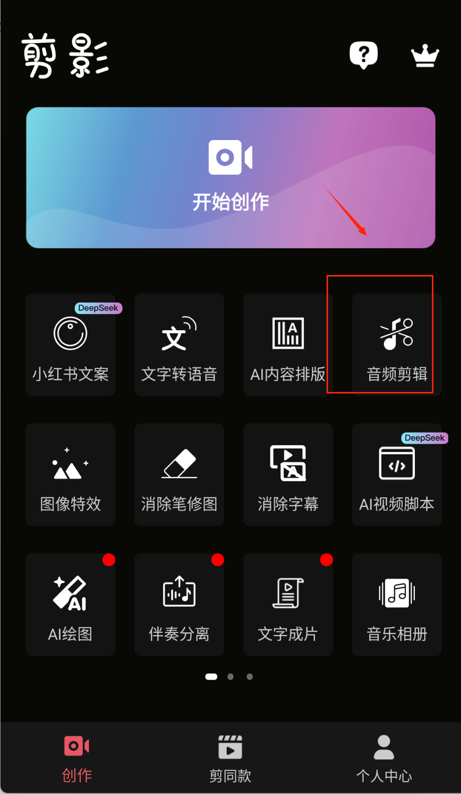 1、在功能区找到音频剪辑选项,点击进入后可以给视频添加背景音乐,软件内置了多种风格的曲库可供选择呢。