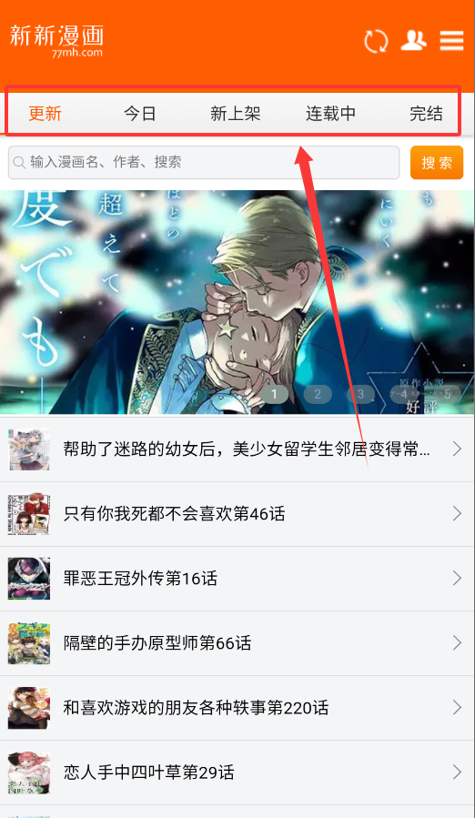 第一,进入网站后先看顶部菜单栏,有更新、今日、新上架、连载中、完结这些标签,直接点就能过滤内容。