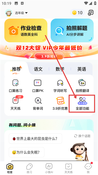 1、在首页点【全部功能】选项,能进入功能分类页面,后续可找到对应学科的学习工具啦。