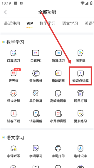 2、进入全部功能页后,在数学学习分类里点【知识点讲解】,就能进入对应学科的知识点页面哦。