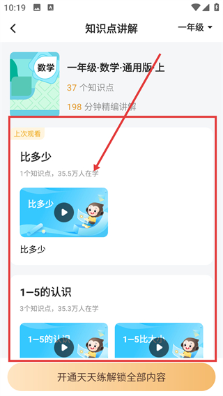 3、进入知识点讲解页后,能看到对应年级的知识点列表,像【比多少】这类内容,点选就能学习啦。