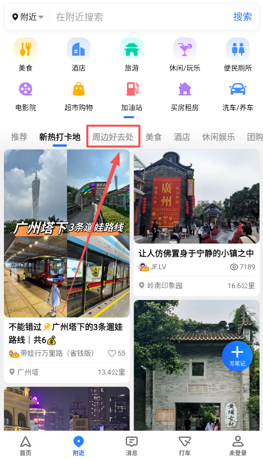 2、查找周边服务时,进入附近页,各类生活需求如电影院、加油站等都汇聚于此,直接点选所需类别,快速找到目标。