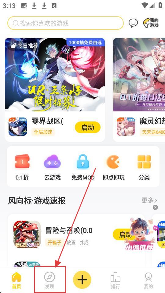 1、我们进入软件,若想探索更多游戏,点击底部【发现】,即可进入发现页面啦。