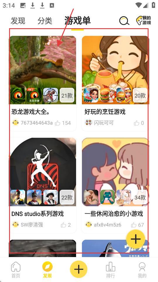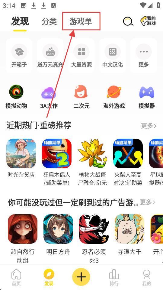 2、在发现页面,若想查看游戏单,点击【游戏单】,就能进入游戏单页面哦。
