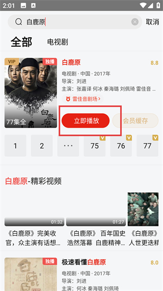 3、搜索结果中找到目标影视(比如【白鹿原】),点击对应的【立即播放】按钮,就能进入播放页面啦。