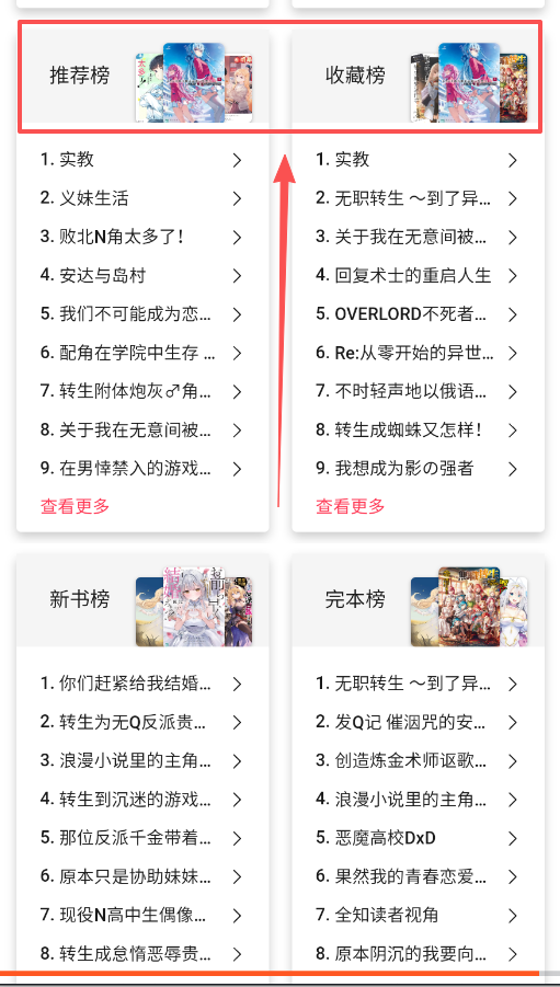 3、浏览排行榜是找书的好方法,收藏榜、新书榜和完本榜分类清晰,可以帮你找到从经典到最新再到已完结的全系列作品。