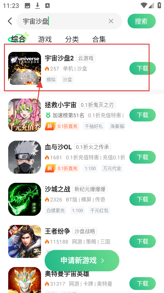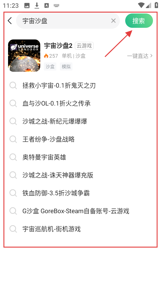 3、在搜索结果里,找到想要下载的游戏,像【宇宙沙盘2】,点击进入该游戏的详情页面啦。