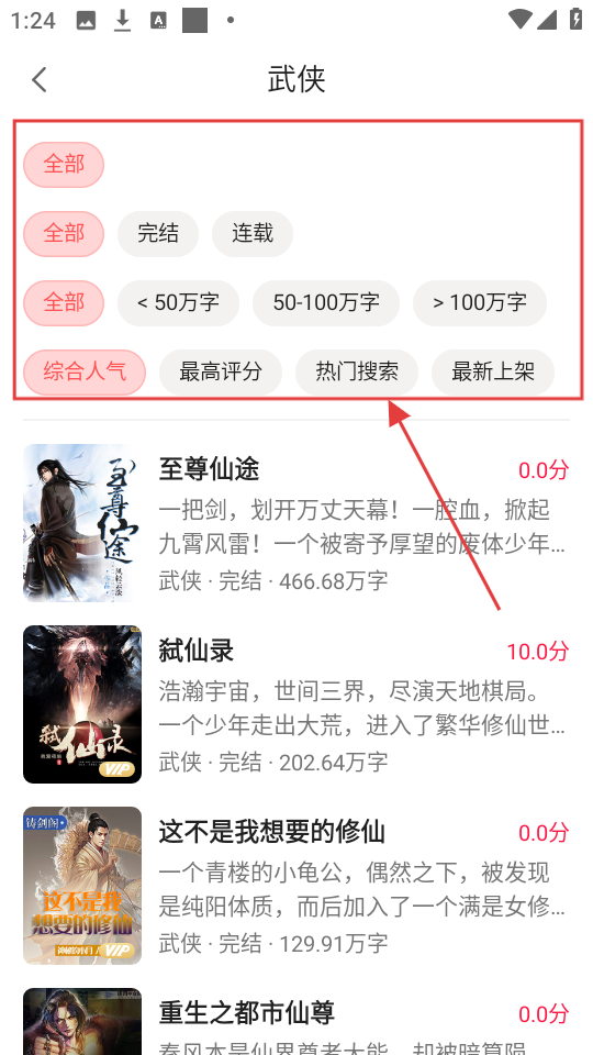 2、在武侠类别界面可通过筛选条件,如字数、状态等,找到心仪的小说啦。