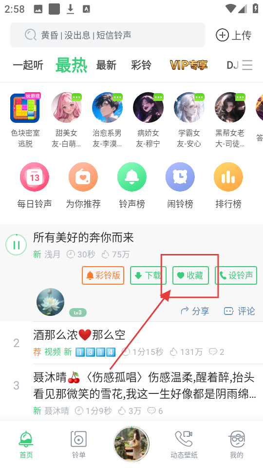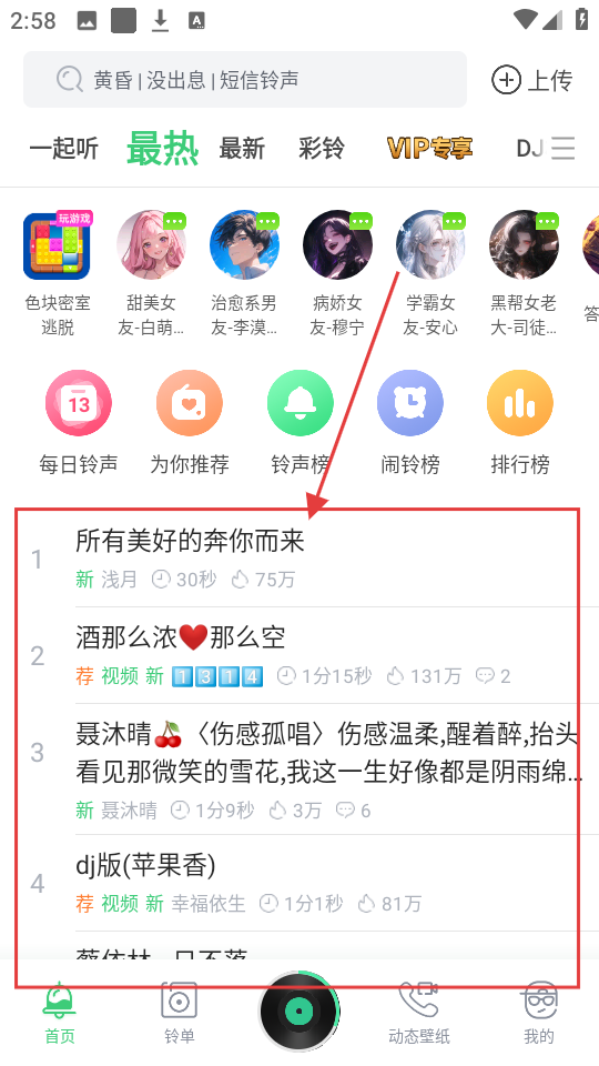 1、我们进入软件首页,能看到各类热门铃声推荐,若有想听的,点击对应的铃声进入播放页面吧。