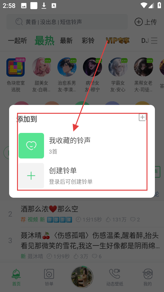 3、点击【收藏】后,会弹出“添加到”窗口,里面有【我收藏的铃声】【创建铃单】等选项,选择要添加的位置哦。