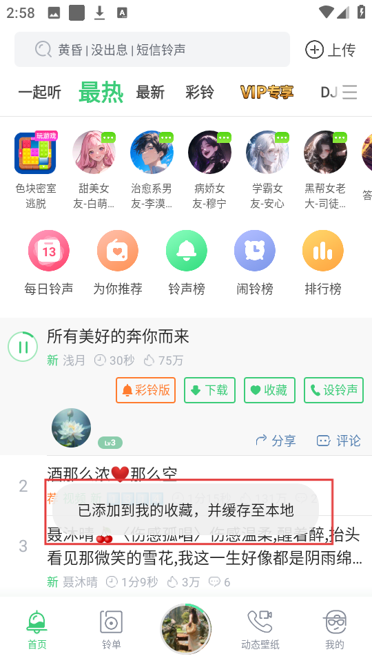 4、选择好后,页面会显示“已添加到我的收藏,并缓存至本地”,这就说明铃声收藏成功啦。