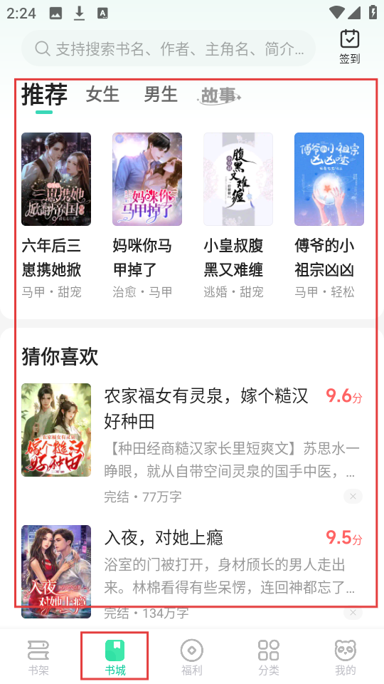 1、在书城页面,有“推荐”“猜你喜欢”等板块,能发现不少有趣的小说,方便挑选阅读。