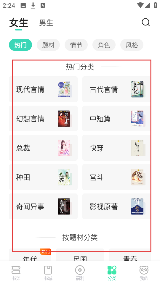 2、进入分类页面,选择“女生”分类,能看到“现代言情”“古代言情”等热门分类,可根据喜好选择。