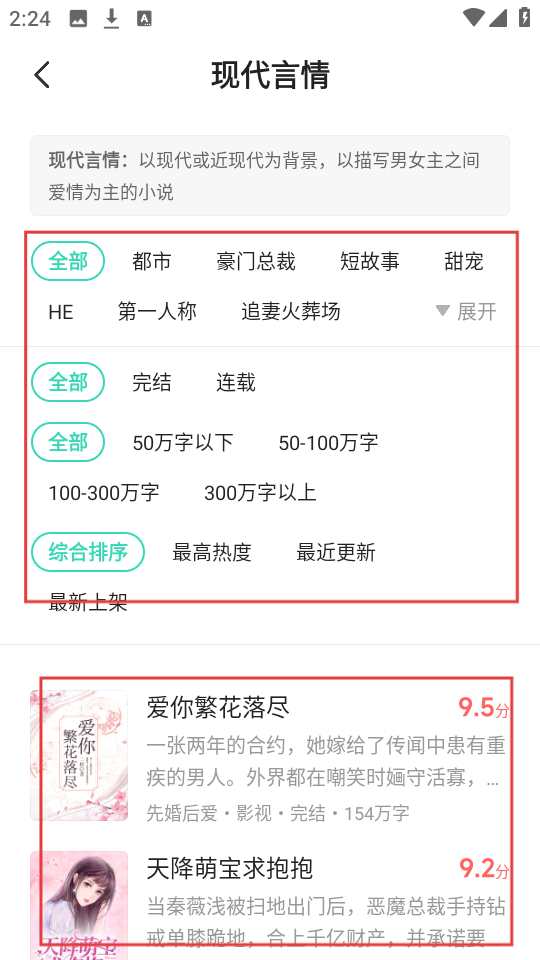 3、点击“现代言情”分类后,可通过“都市”“豪门总裁”等标签,以及字数、排序方式,精准找到想看的小说。
