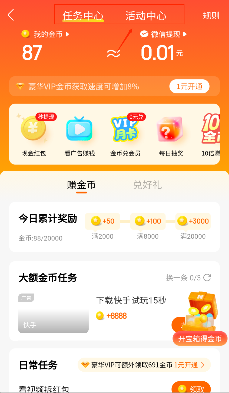 2、赚钱功能位于底部导航栏,进入页面后能看到当前金币数量和可提现金额,通过完成看广告、下载试玩应用或开通VIP等任务可获取金币。