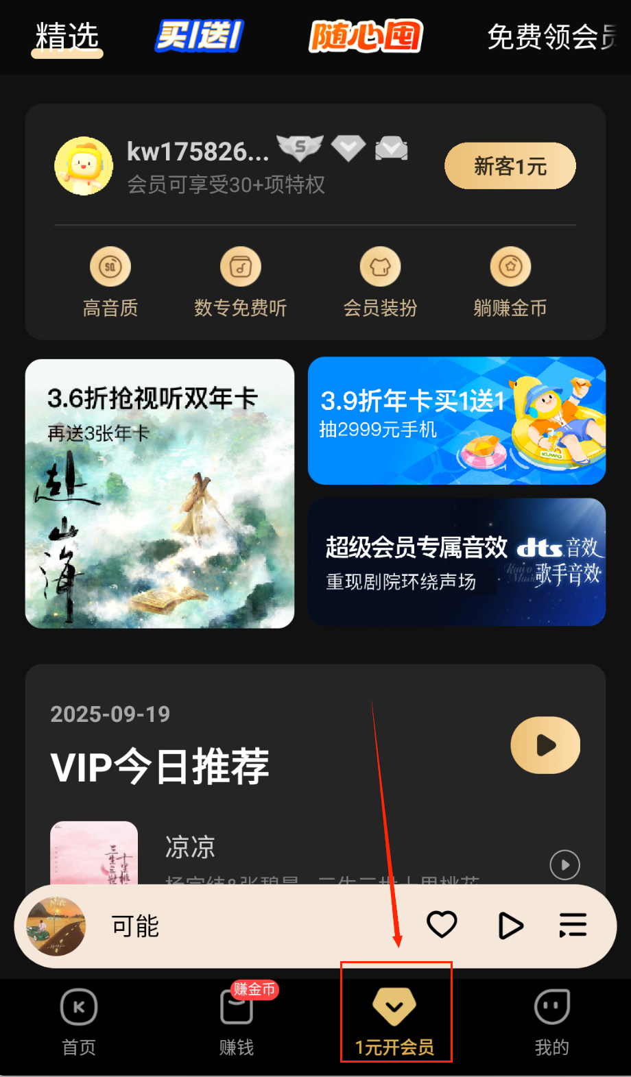 3、会员权益方面,首页常有新客1元开通活动,享受高音质、数字专辑免费听等特权,限时优惠如3.9折年卡买一送一非常划算。