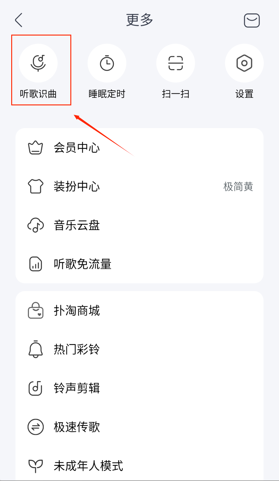 4、实用功能包括听歌识曲可快速识别背景音乐,睡眠定时能设置自动停止播放,扫一扫可获取音乐资源,装扮中心允许更换主题皮肤。