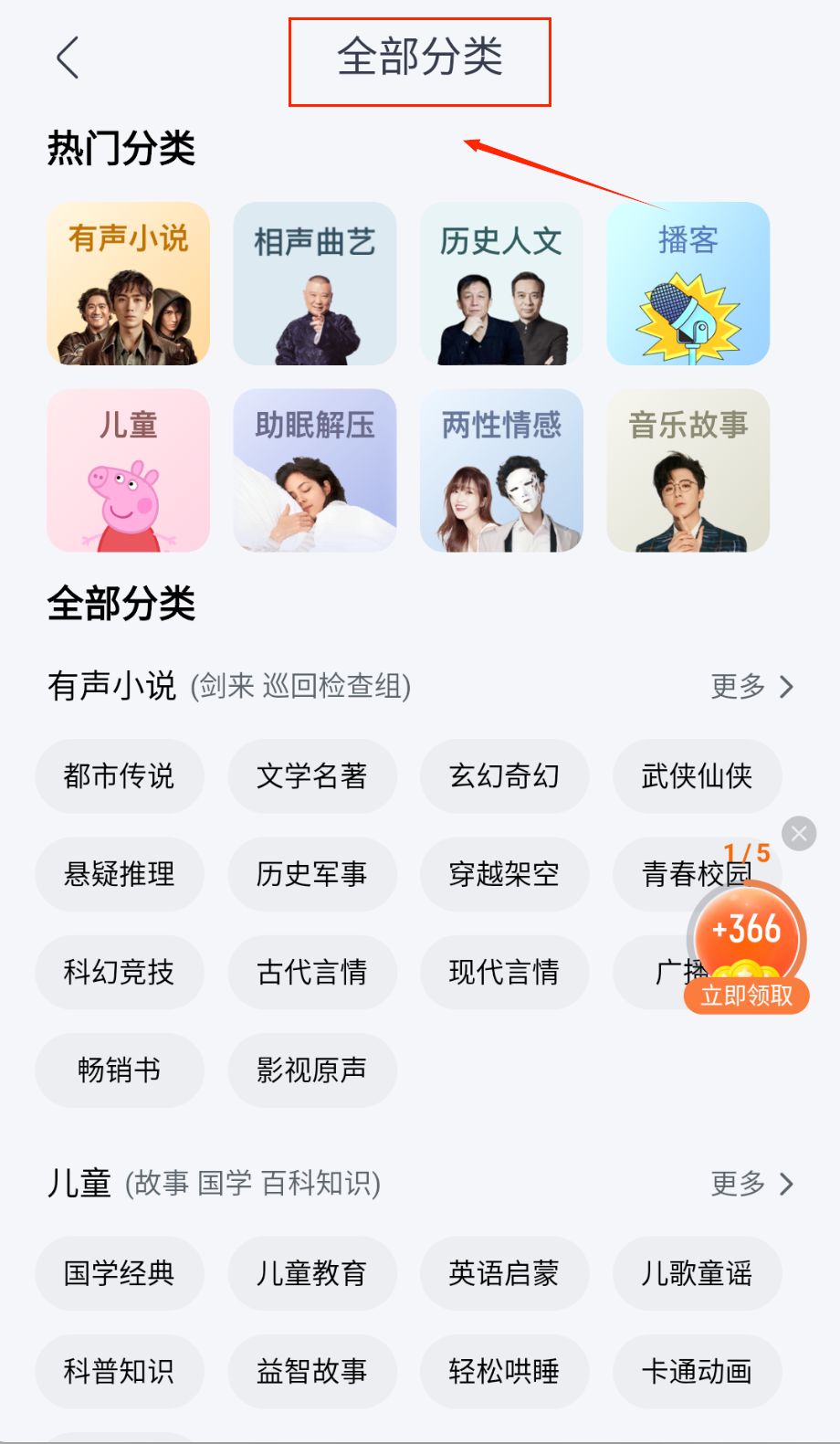 1、在“听书”或“全部分类”页面,你可以找到海量有声内容,比如热门小说“剑来”或“盗墓笔记”,直接点击就能收听,还能按分类筛选。