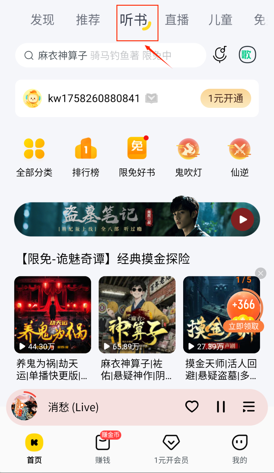 1、在“听书”tab里藏着超多有声内容,比如小说“盗墓笔记”或儿童“国学经典”,适合开车或睡前听,分类很全就像个声音图书馆。
