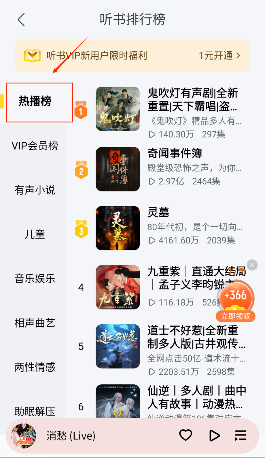 4、热门搜索和排行榜是找内容的捷径,榜单会实时更新“剑来”这样的热门有声书或DJ神曲,懒得自己找的时候跟着大众口味选总没错。