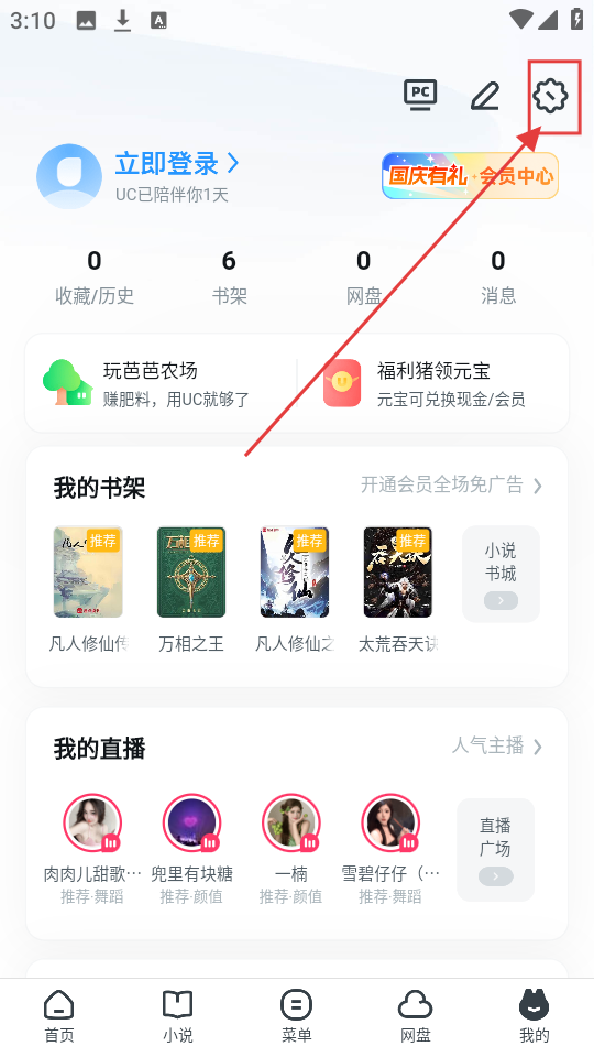 2、到了个人页面,别着急,点击右上角的设置图标,这样就能进入设置界面,找到清理相关选项啦。